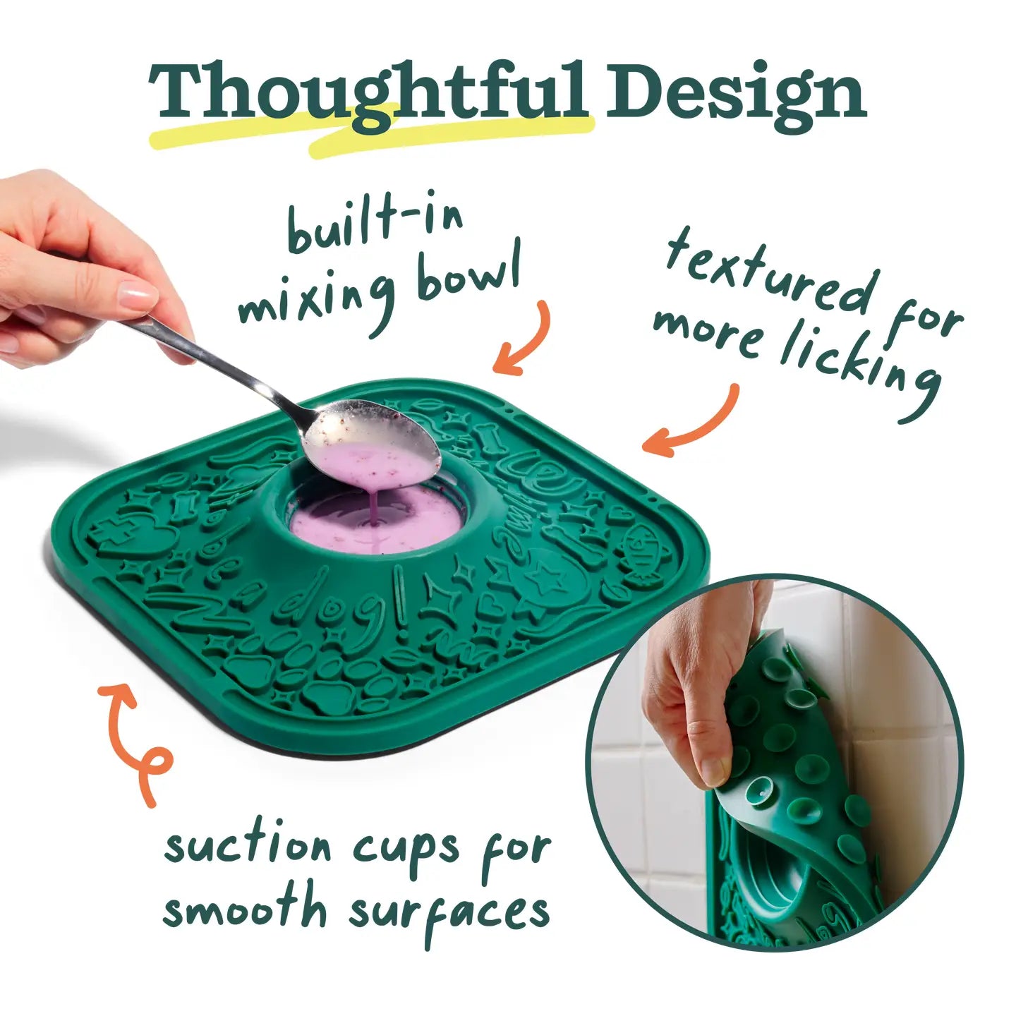 Our LickMat features suction cups for grip, is made of a non-toxic, BPA- and phthalate-free natural rubber, and comes in two colors: Forest Green and Lavender.