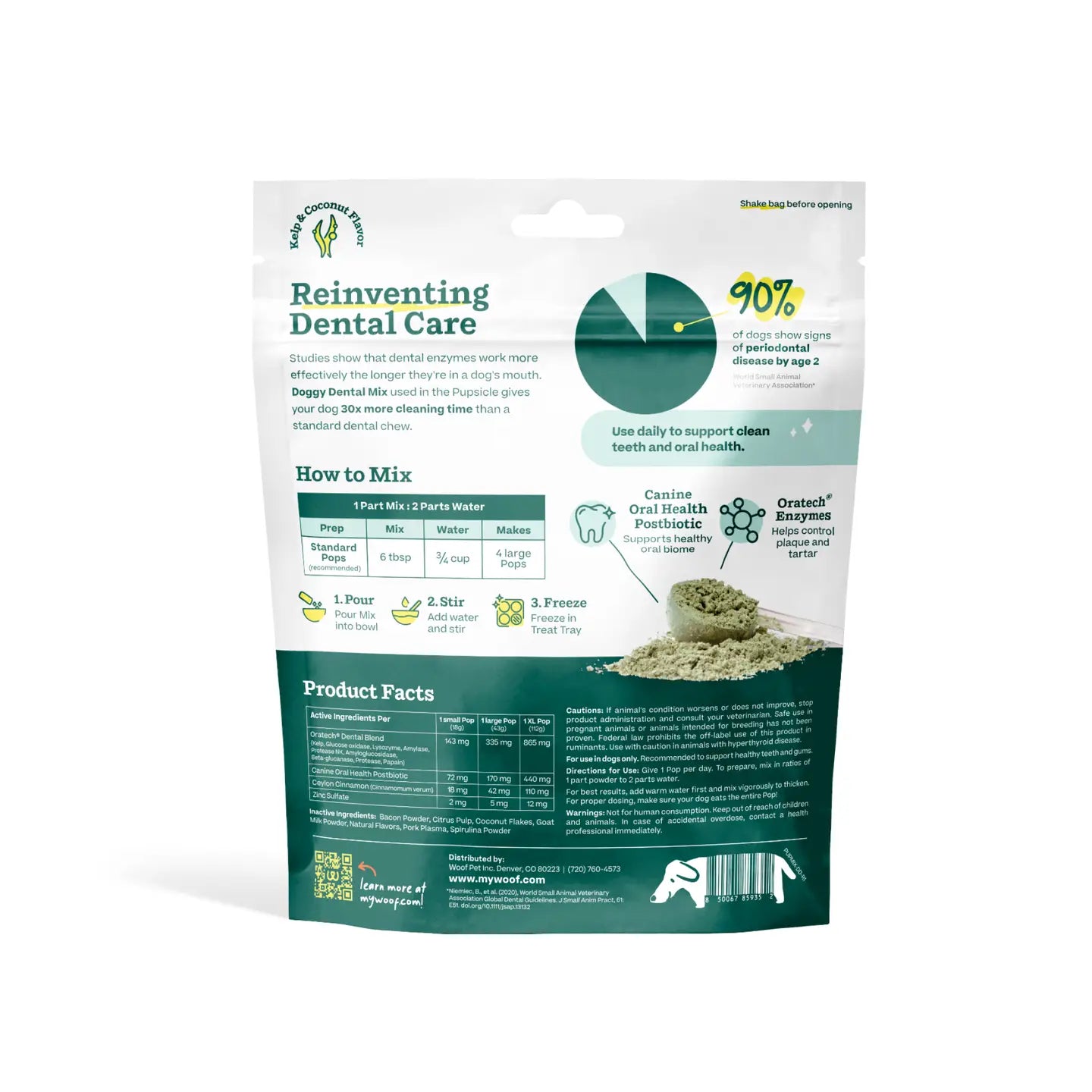 Over 90% of dogs show signs of periodontal disease by age 2, but Doggy Dental Mix’s clinically-backed ingredients can help control plaque and tartar when used as a daily dental habit. The OraTech® dental enzyme blend helps to balance the oral microbiome by targeting the bad bacteria that impact dental health, allowing beneficial bacteria to thrive–while the Pupsicle increases the time the enzymatic cleaners have to work.